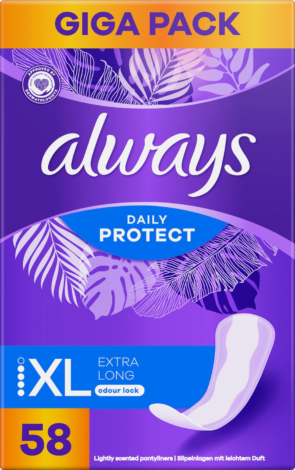 Always Daily Protect Extra Long -pikkuhousunsuojat suojaavat koko päivän. Nämä ovat Alwaysin pisimmät pikkuhousunsuojat, jotka takaavat maksimaalisen suojan, ja niissä on ainutlaatuinen hajuja neutralisoiva teknologia, joka takaa huomaamattomuuden. Imukykyisen alueen ja sivujen suojareunojen ansiosta ne sopivat päivittäiseksi suojaksi valkovuotoon, epäsäännöllisiin tai niukkoihin kuukautisiin tai vähäiseen vuotoon. Nauti puhtaiden pikkuhousujen raikkaasta tunteesta!