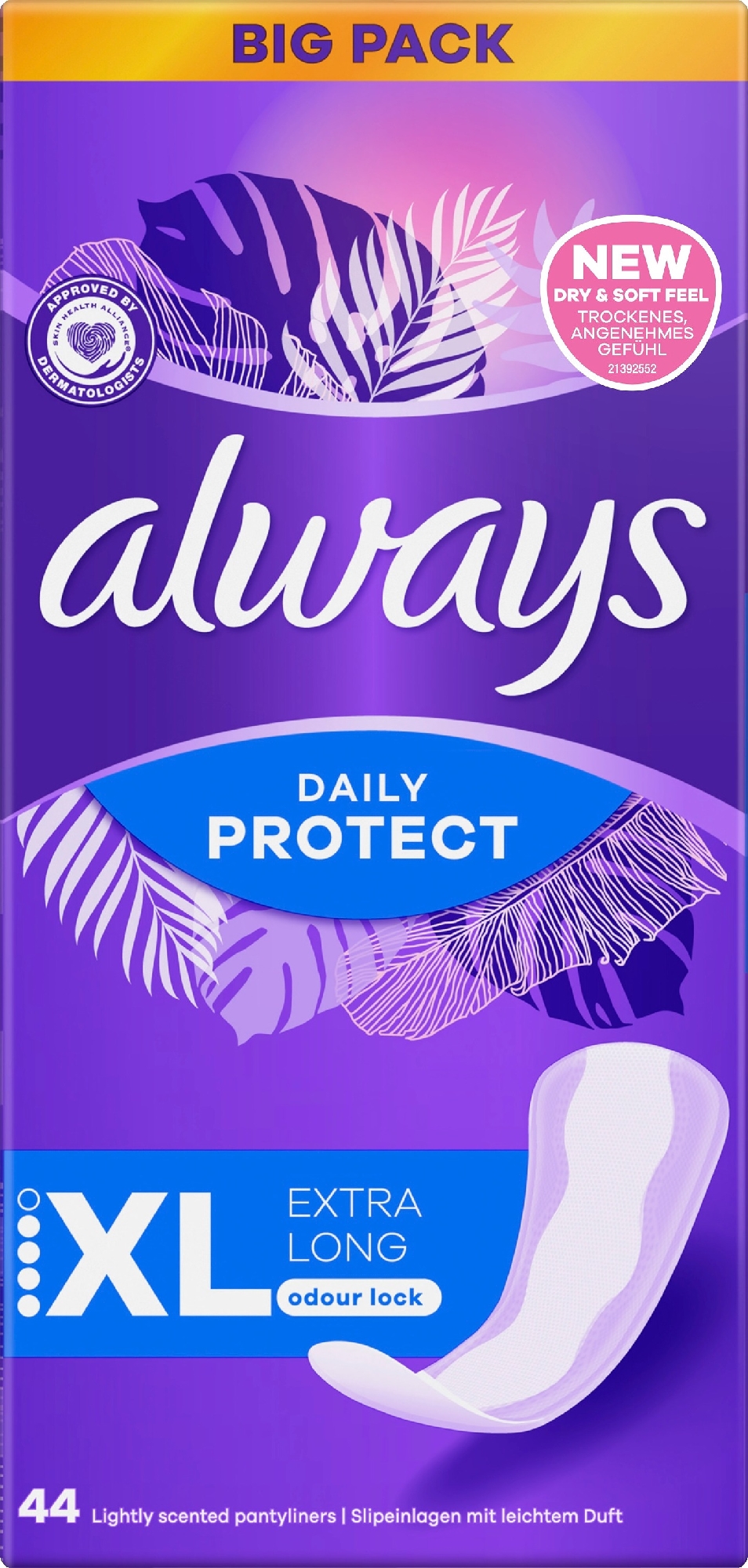 Always Dailies Long Plus Extra Protect -pikkuhousunsuojat suojaavat ja pitävät olon raikkaana koko päivän. Niissä on lisäsuojaa antava pidempi takaosa sekä häiritseviä tuoksuja neutralisoiva tekniikka ja imukykyinen alue, jotka antavat luotettavaa raikkautta. Ihanteelliset valkovuotoon ja suojaksi epäsäännöllisiin kuukautisiin tai niukkaan vuotoon. Suojaa jopa 100 % häiritseviltä tuoksuilta. Pikkuhousunsuojien suojareunat antavat paremman suojan ohivuotoja vastaan. Dermatologisesti testattu pikkuhousunsuoja, joka on todettu hellävaraiseksi iholle. Sisältää miedon tuoksun.