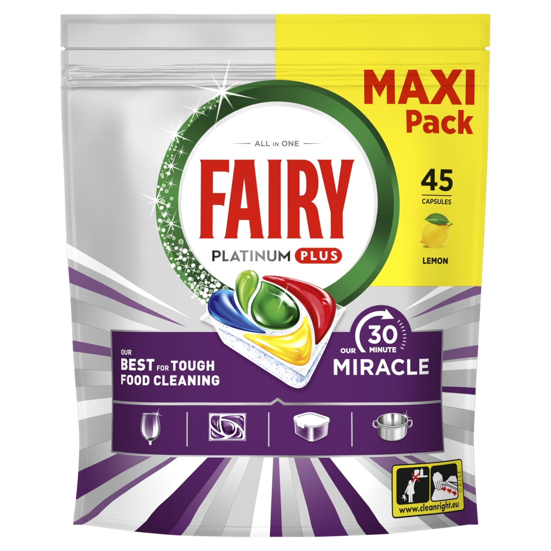 MIRACLE ALL-IN-ONE -RATKAISU, JOKA TEKEE ASTIOISTA HOHTAVAN PUHTAITA. Tutustu Fairyn 30 Minute Miracle Platinum Plus -astianpesutabletteihin, jotka ovat Fairyn paras ratkaisu pinttyneen lian puhdistamiseen. Nämä Miracle All-in-One -astianpesutabletit saavuttavat moitteettoman lopputuloksen vaivattomasti lyhyimmissäkin pesuohjelmissa ja jättävät jälkeensä kevyen sitruunan tuoksun. Viisi geelin tehoa takaa säihkyvän puhtaat astiat, erinomaisen kiillon, nopean kuivumisen, rasvasuodattimen puhdistuksen ja Anti-dull-teknologian. Sisältää 3 kertaa enemmän rasvaa poistavia ainesosia kuin Fairy Original All-in-One, joten se poistaa pinttyneet ruokatahrat jo 30 minuutissa.