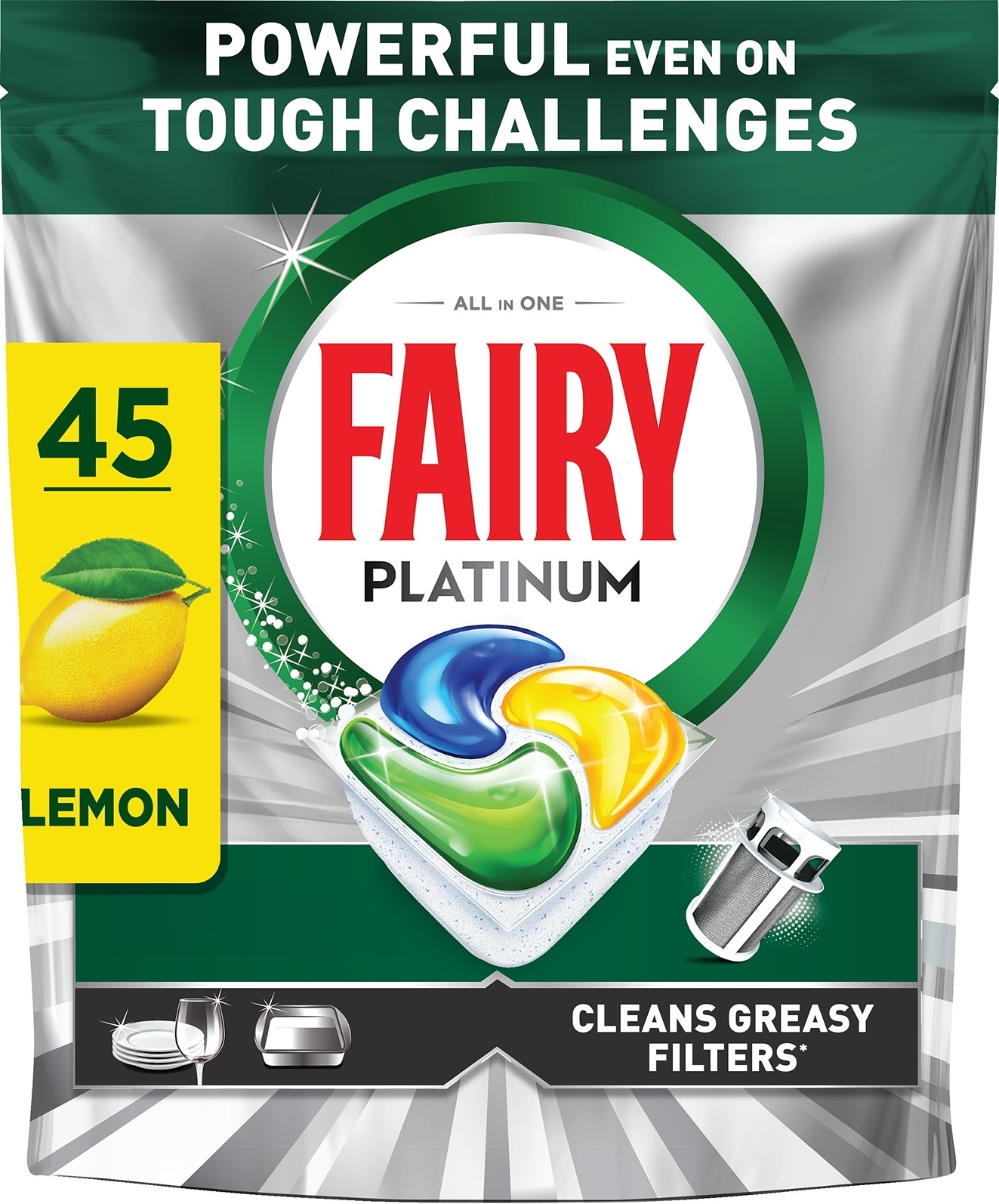 Fairy Platinum All in One -konetiskitabletit puhdistavat ensimmäisellä pesukerralla ja läpäisevät haastavimmankin lian tehden astioista hohtavan puhtaita. Fairy Platinumin puhdistusteho antaa itseluottamusta monipuoliseen ruoanlaittoon. Se puhdistaa myös rasvaisen suodattimen jättäen astiasi ja astianpesukoneesi raikkaan puhtaiksi. Fairy yhdistää nesteen ja jauheen yhdeksi tehokkaaksi kapseliksi. Ultraliukoinen pussi liukenee nopeasti, joten se alkaa puhdistaa nopeasti ja tekee valmista. Ja ne ovat todella helppokäyttöisiä! Tablettia ei tarvitse avata, laitat sen vain astianpesukoneen pesuainelokeroon.