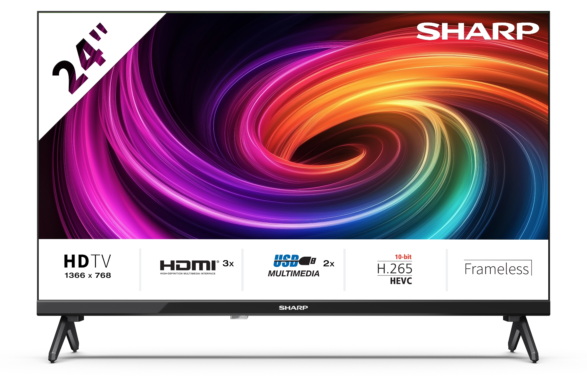 Sharp 24" 24HA1705E (2025) HD Ready (1366 x 768), 3xHDMI (ARC/CEC), 2xUSB (FAT16/32, NTFS), 3xRCA, Coaxial Digital Audio, DVB-T/T2/C/S/S2 viritin H.265/HEVC, Active Motion, Dolby Digital,kaukosäädin, sivujalat, paristot, pikaopas
