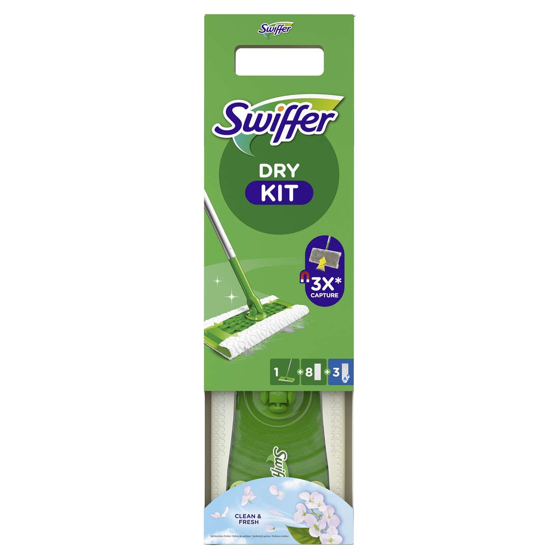 Swiffer DRY moppi (+ 8 kpl kuivaa + 3 kpl kosteaa lattianpuhdistusliinaa).