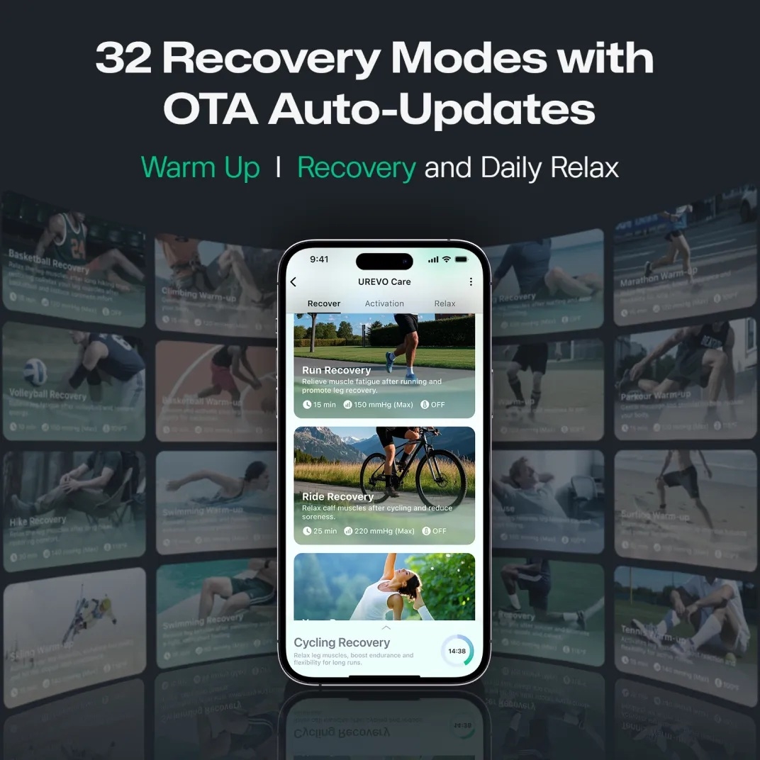 Hierovat UREVO AI-Powered Wireless Recovery Boots -lihashuoltosaappaat on suunniteltu edistämään palautumista urheilusuorituksen jälkeen. Tekoälyohjattu järjestelmä analysoi lihasten tilaa reaaliaikaisesti ja luo näiden perusteella tarpeellisen palauttavan ohjelman. Järjestelmä säätää esimerkiksi ilmanpainetta palautumisen optimoimiseksi.
