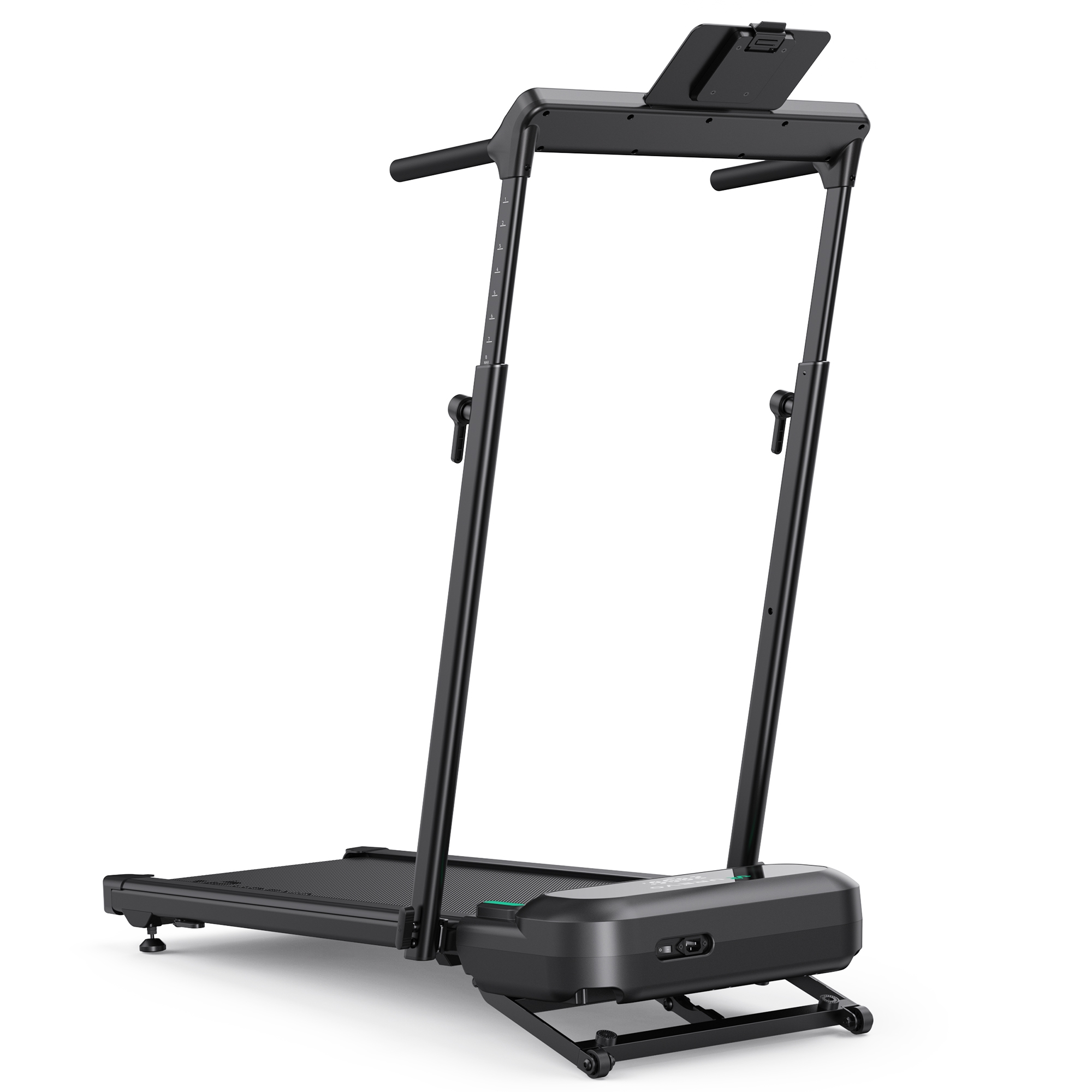 Taitettavat käsituet ja niihin kiinnitettävä työtaso voidaan vaivatta kääntää pois tieltä, kun niitä ei tarvita. Käytössä käsituista voi pitää kiinni ja työtasolle voidaan asettaa esimerkiksi juomapullo tai vaikkapa kannettava tietokone. Kahdeksanportaisen korkeussäädön ansiosta juoksumattoa voi käyttää päätetyöskentelyyn jokaiselle sopivalla korkeudella.