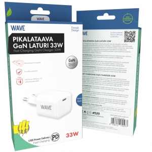 Wave Pikalataava GaN -verkkolaturi kahdella USB Type-C liitännällä ja USB Type-C -> USB Type-C -kaapelilla (1m). Kokonaisteho 35W. Kahta laitetta ladattaessa latausvirta optimoidaan laitteiden välillä sopivaksi. Väri: valkoinen.