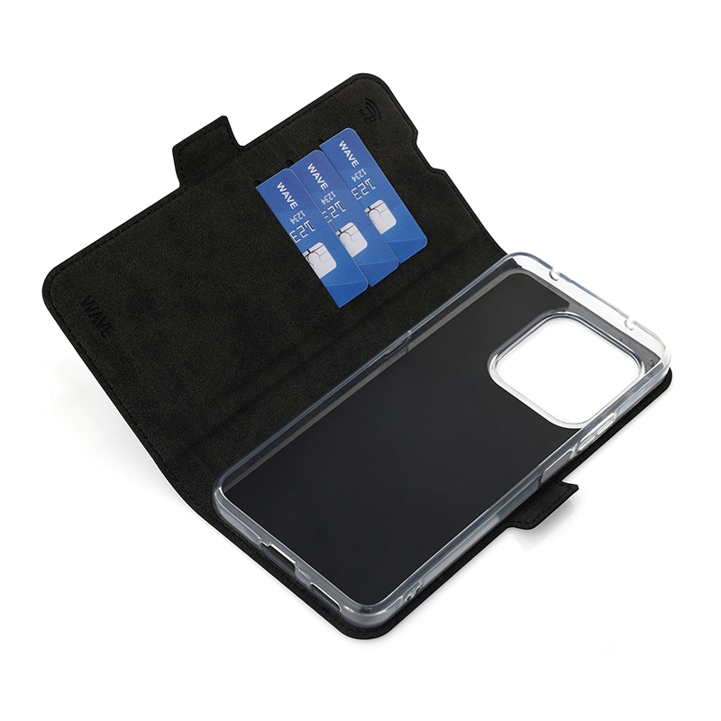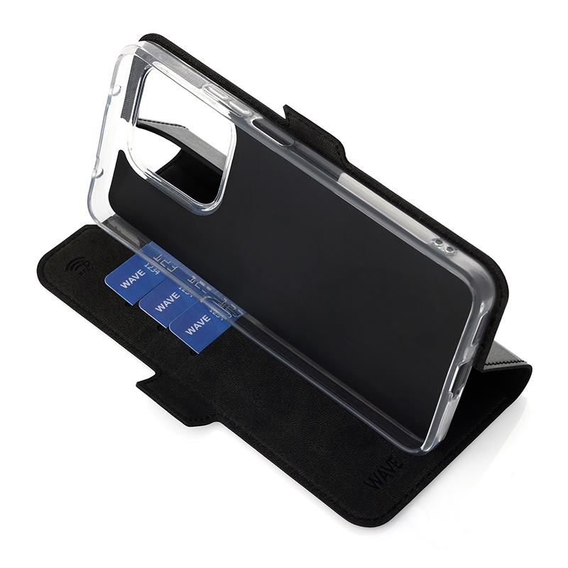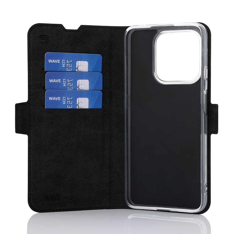 Wave Book Case musta suojakotelo Honor 400 Smart 5G puhelimelle. Magneettisulkuinen kansi, korttipaikat RFID suojauksella ja läpinäkyvä muovikelkka (TPU). Pintamateriaali laadukasta nahkaa, jossa antimikrobipinnoite.