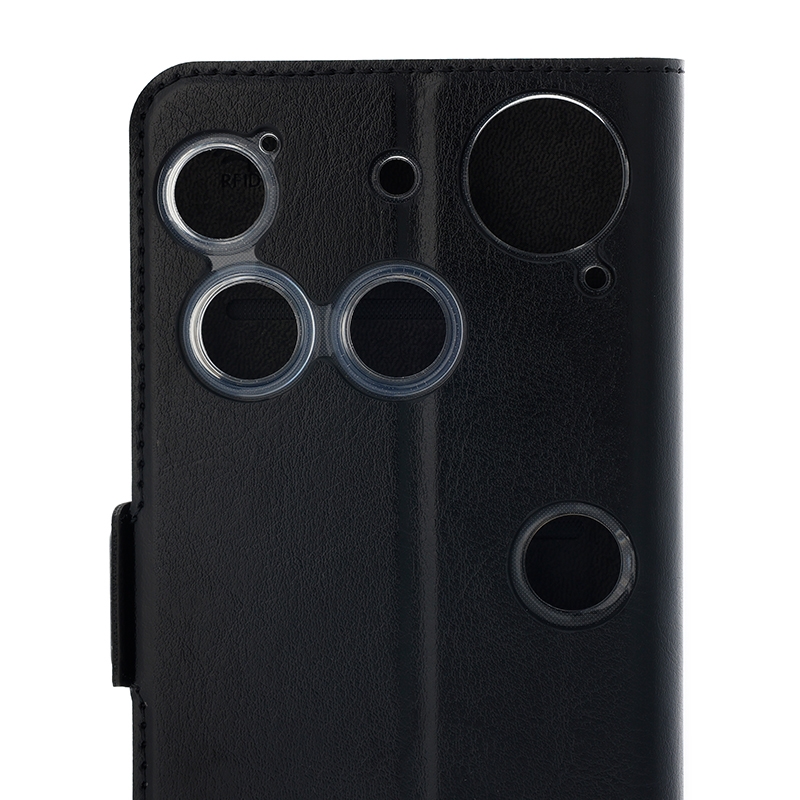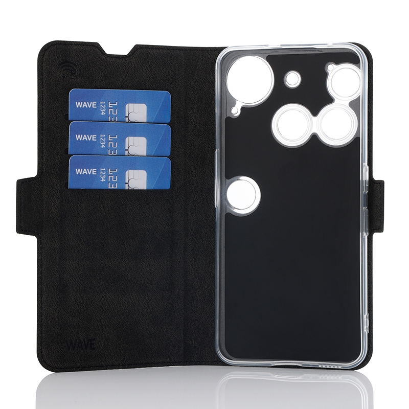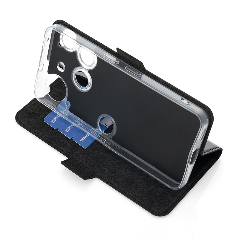 Wave Book Case musta suojakotelo Nothing Phone (3) puhelimelle. Magneettisulkuinen kansi, korttipaikat RFID suojauksella ja läpinäkyvä muovikelkka (TPU). Pintamateriaali laadukasta nahkaa, jossa antimikrobipinnoite.