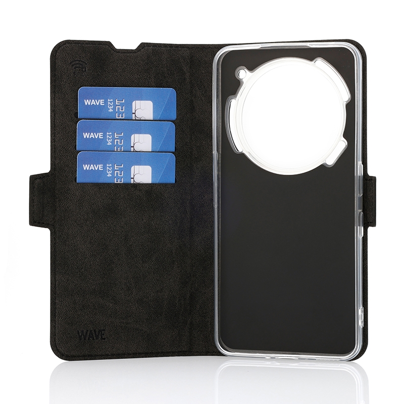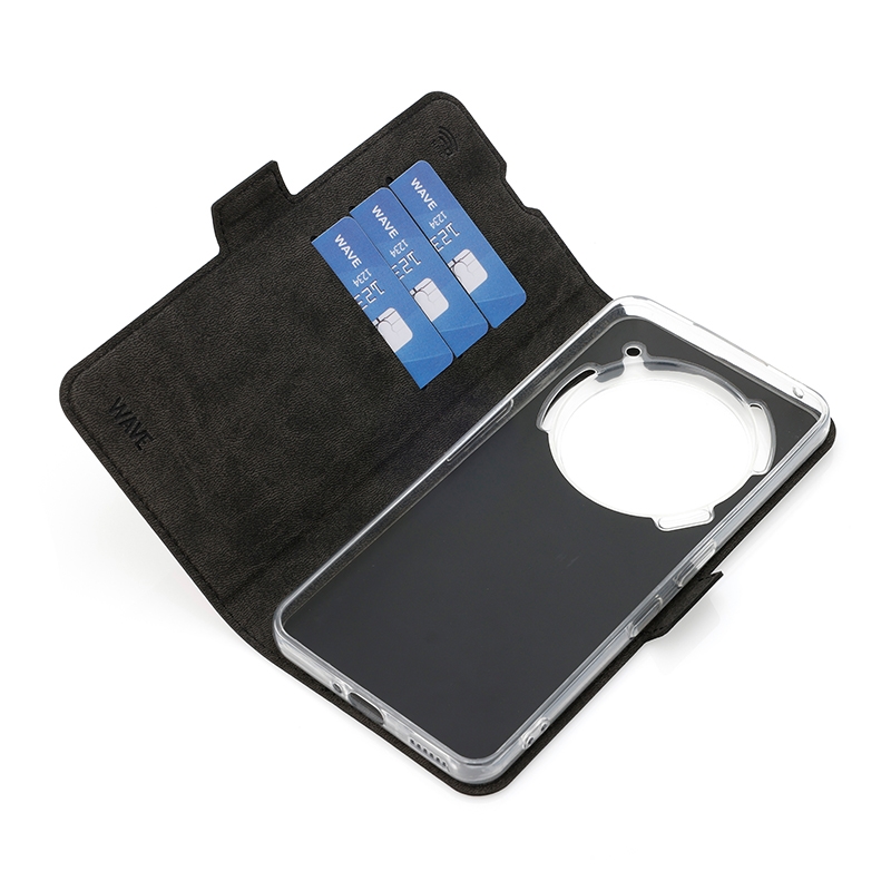 Wave Book Case musta suojakotelo Nothing Phone (3a) Pro puhelimelle. Magneettisulkuinen kansi, korttipaikat RFID suojauksella ja läpinäkyvä muovikelkka (TPU). Pintamateriaali laadukasta nahkaa, jossa antimikrobipinnoite.
