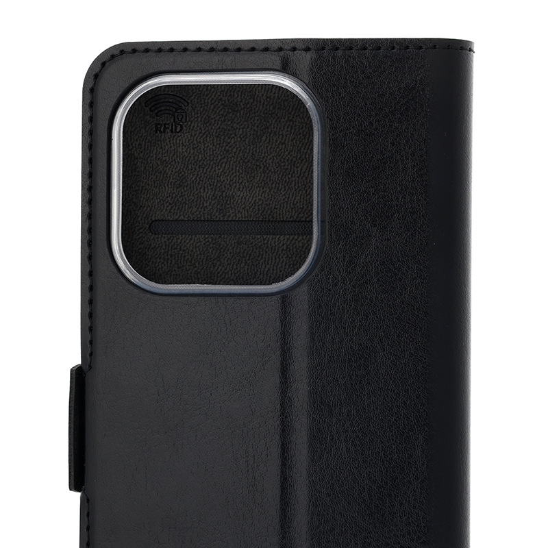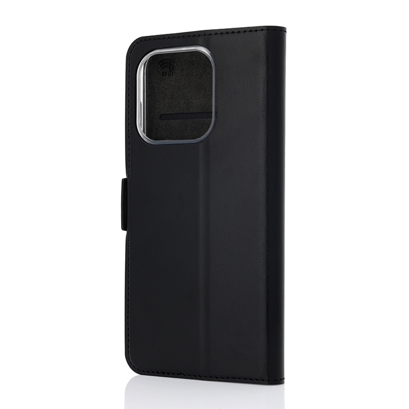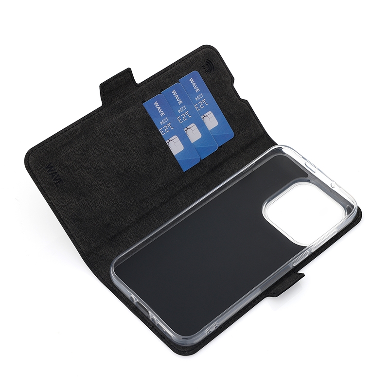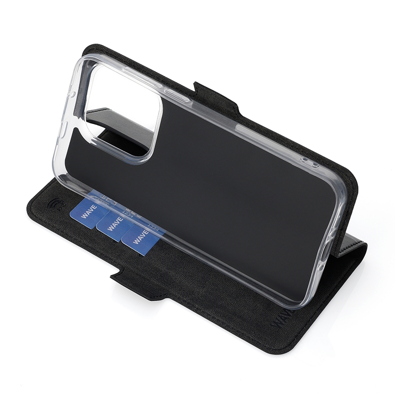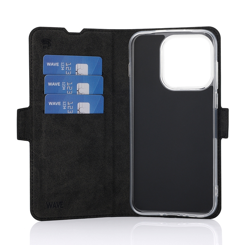 Wave Book Case musta suojakotelo OnePlus 15 puhelimelle. Magneettisulkuinen kansi, korttipaikat RFID suojauksella ja läpinäkyvä muovikelkka (TPU). Pintamateriaali laadukasta nahkaa, jossa antimikrobipinnoite.