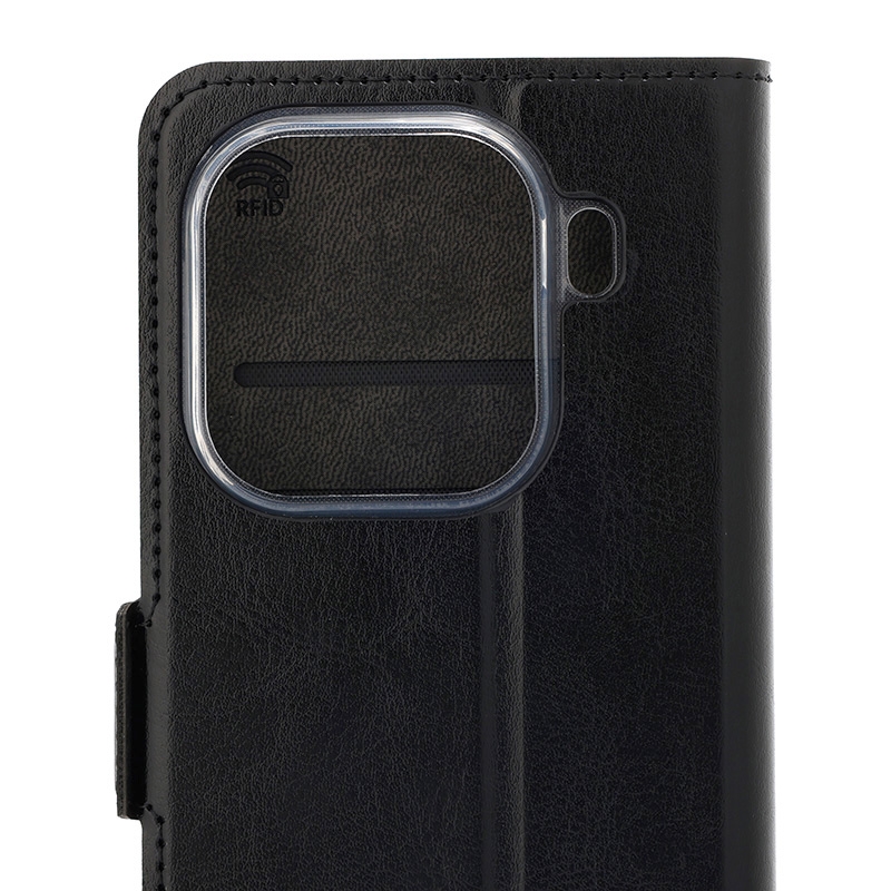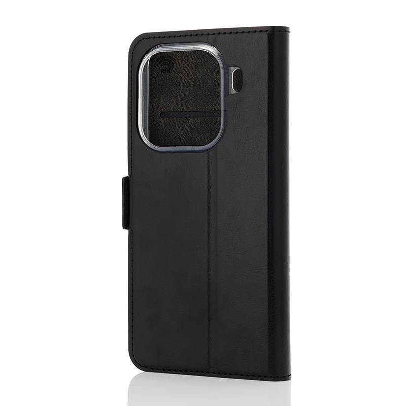 Wave Book Case musta suojakotelo Oppo Find X9 Pro puhelimelle. Magneettisulkuinen kansi, korttipaikat RFID suojauksella ja läpinäkyvä muovikelkka (TPU). Pintamateriaali laadukasta nahkaa, jossa antimikrobipinnoite.