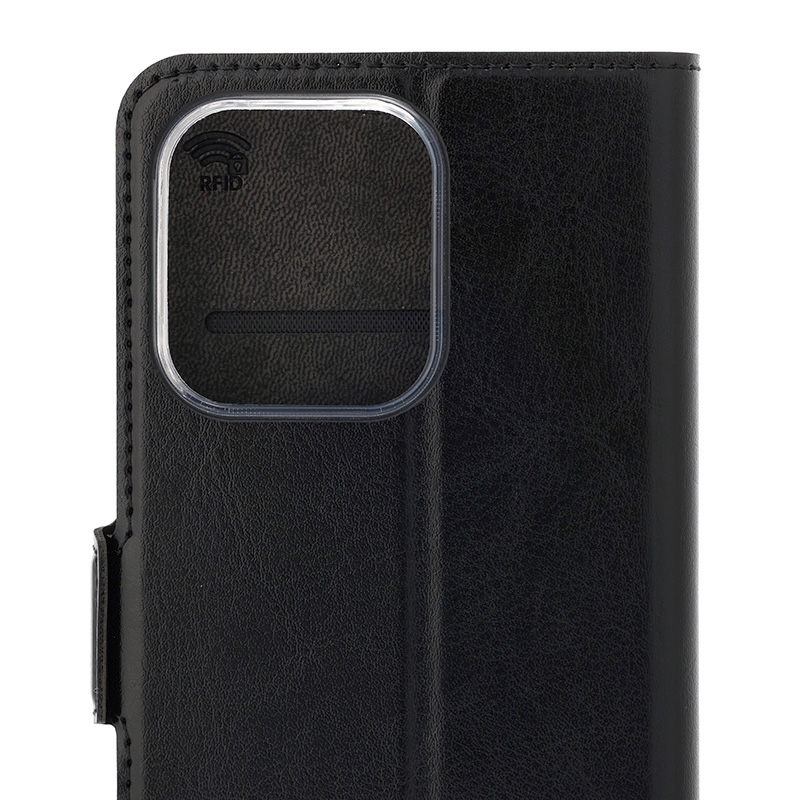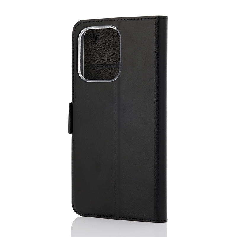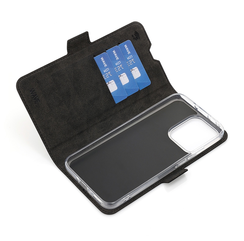 Wave Book Case musta suojakotelo Oppo Reno 14 5G puhelimelle. Magneettisulkuinen kansi, korttipaikat RFID suojauksella ja läpinäkyvä muovikelkka (TPU). Pintamateriaali laadukasta nahkaa, jossa antimikrobipinnoite.