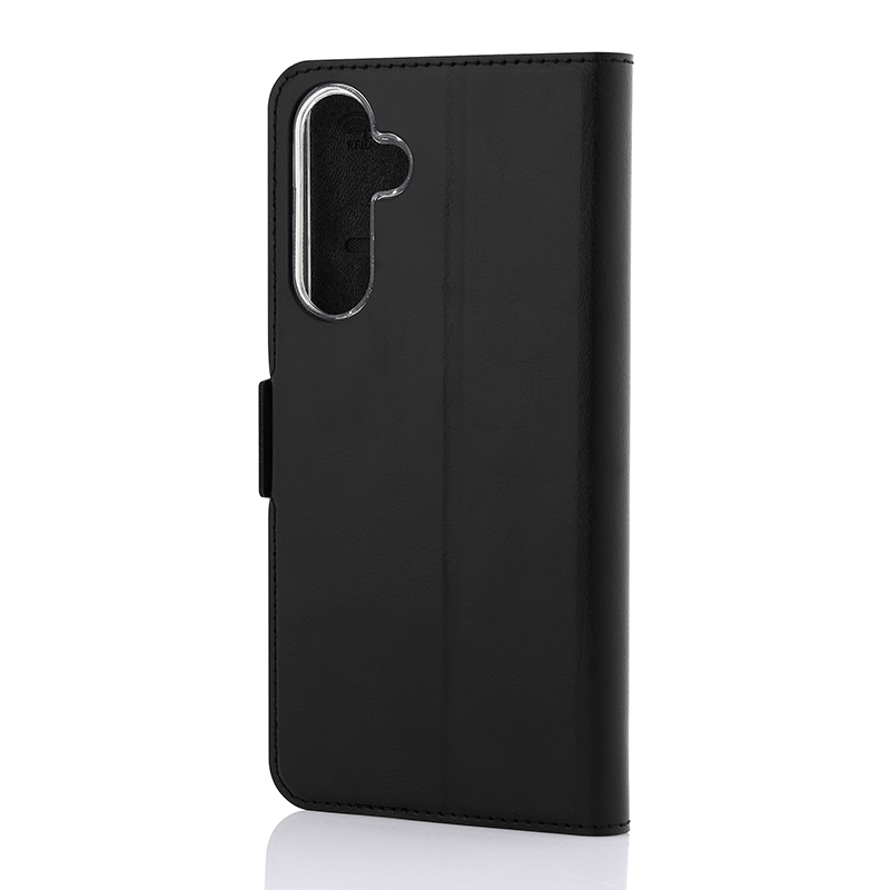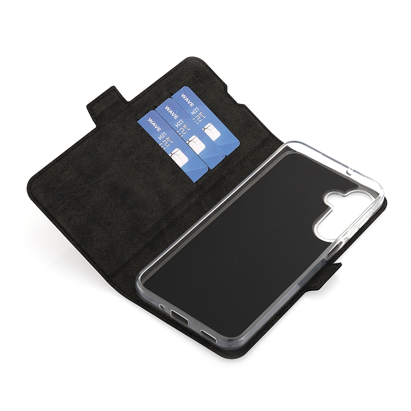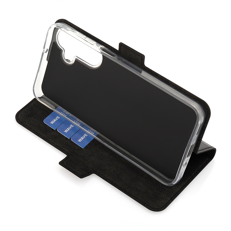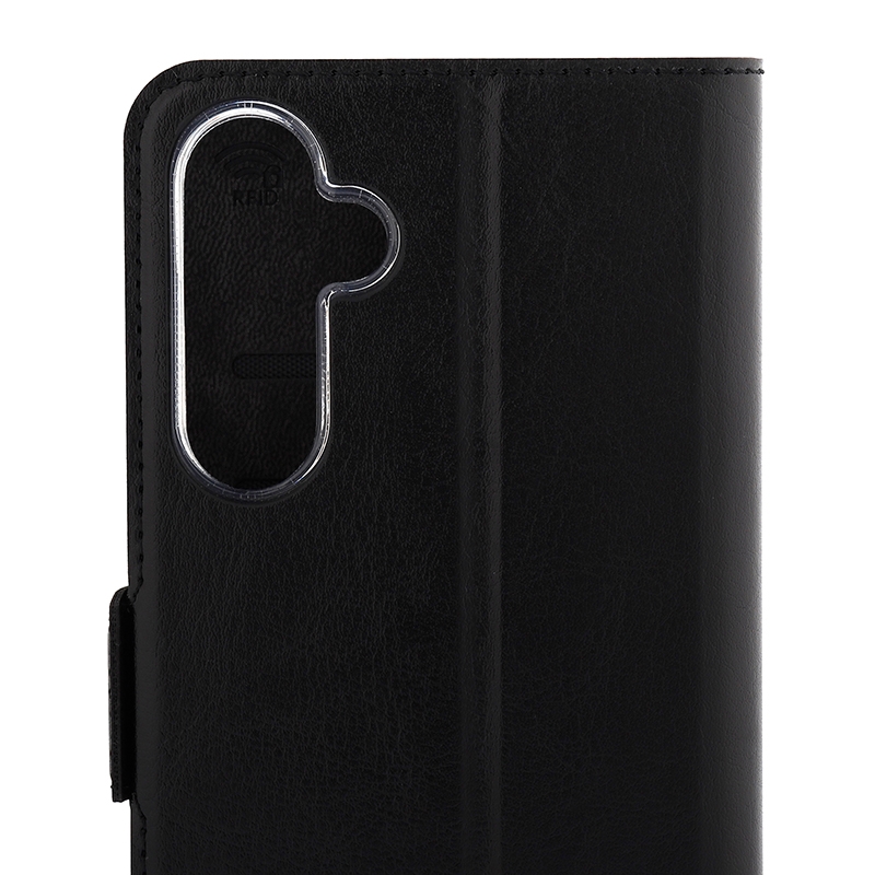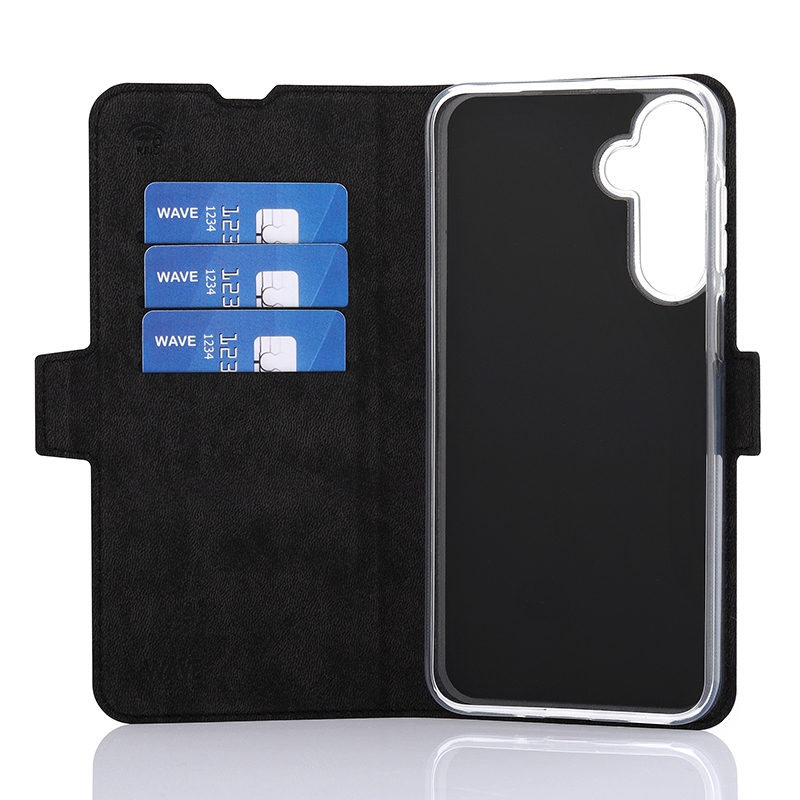 Wave Book Case musta suojakotelo Samsung Galaxy A16 5G, Samsung Galaxy A16 4G puhelimille. Magneettisulkuinen kansi, korttipaikat RFID suojauksella ja läpinäkyvä muovikelkka (TPU). Pintamateriaali laadukasta nahkaa, jossa antimikrobipinnoite.